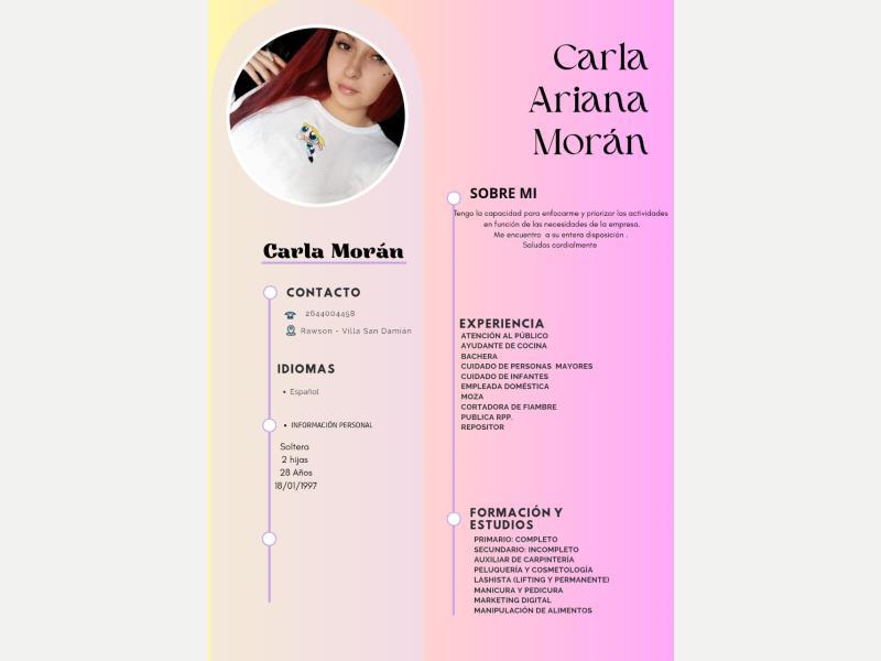 Hola buenas me ofresco para cuidado de persona mayores,niños, limpieza, atención al público, ayudante de cocina,moza lo que sea tengo experiencia y referencias, aprendo rápido me adapto a cualquier ambiente ,full time2644004458