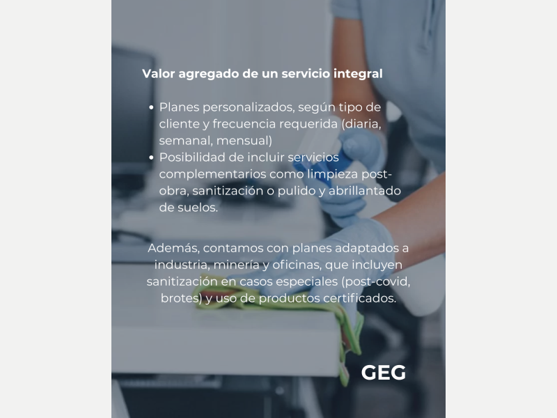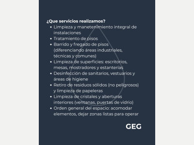 SERVICIOS DE LIMPIEZA En GEG brindamos servicios de limpieza y mantenimiento profesional para empresas, industrias y flotas de vehículos.Nos enfocamos en garantizar espacios seguros, higiénicos y presentables, cuidando cada detalle con productos adecuados y personal capacitado.