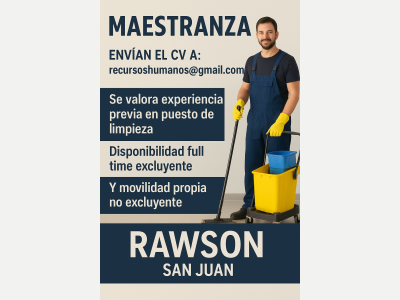 Se busca personal de Limpieza para trabajar en horario comercio preferentemente con movilidad propia en zona de Rawson Enviar currículum a [email protected]. Colocar en asunto maestranza- Maestranza