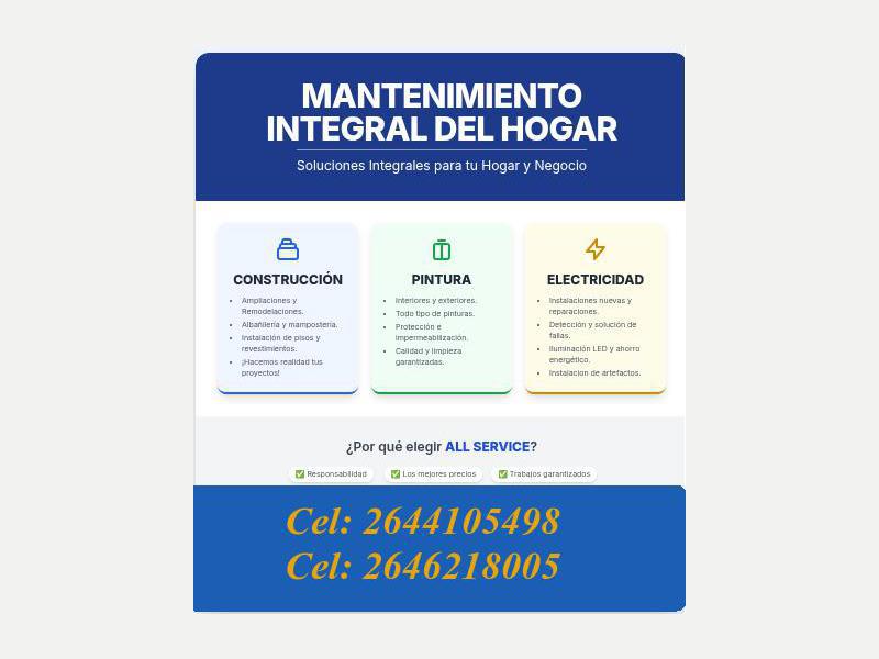 Servicios generales Servicio integral del hogar, pintura, electricidad, construccion, consultas y presupuesto gratis en el gran San Juan, al - 2646218005 -