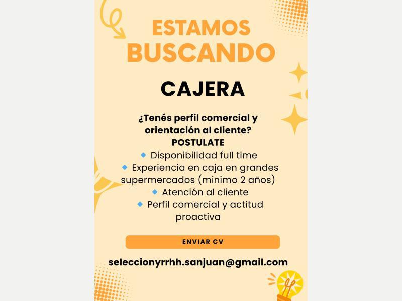 Tenés perfil comercial y orientación al cliente ¡Queremos conocerte! Disponibilidad full time. Experiencia en caja en grandes supermercados(minimo 2 años). Atención al cliente. Perfil comercial y actitud proactiva