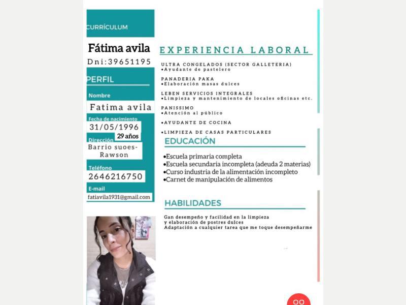 Mi nombre es Fátima Ávila.Estoy buscando trabajo con disponibilidad full time.Tengo experiencia en limpieza, ayudante de cocina, ayudante de panadería/pastelería y atención al público. Cuento con carnet de manipulación de alimentos. 26462167502646216750