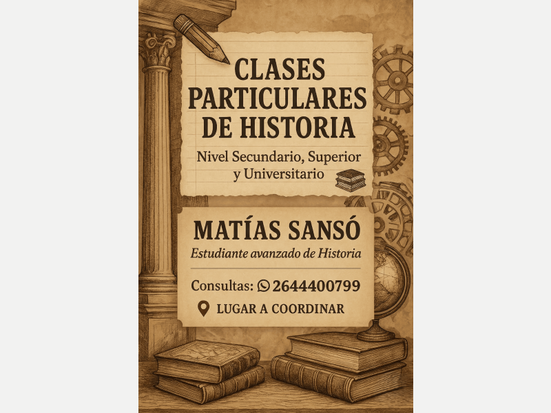 PREPARO ALUMNOS EN HISTORIA Y CIENCIAS SOCIALES Alumno avanzado en la carrera preprara alumnos de nivel secundario, superior y universitario.Lugar a coordinar.