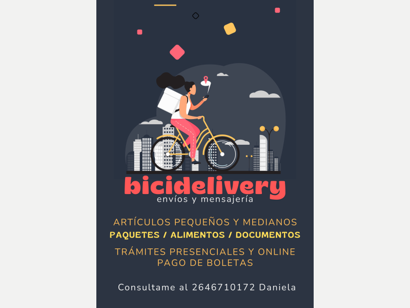 Bici Delivery Servicio 100% personalizado para envíos y mensajería. También ofrezco servicios para Trámites (presenciales y online), Pago de boletas, hacer compras específicas. Confianza, responsabilidad y eficiencia. Recibo consultas con mucho gusto