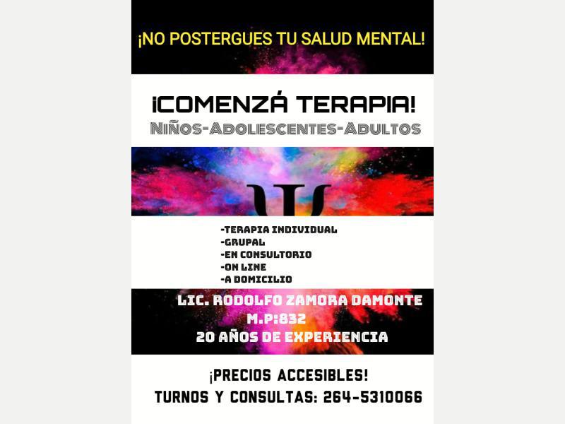 No postergues tu salud mental. Comenzá terapia. Lic. Rodolfo Zamora Damonte M.P: 832. 20 años de experiencia. Atención en consultorio, on line y a domicilio. Niños, adolescentes y adultos.