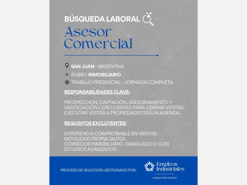 Importante empresa del rubro inmobiliario busca sumar a su equipo Asesores Comerciales. Vacantes: 3. Trabajo Presencial. Jornada Completa. Postulate enviando tu CV a [email protected] con asunto: ASESOR COMERCIAL- VENTAS