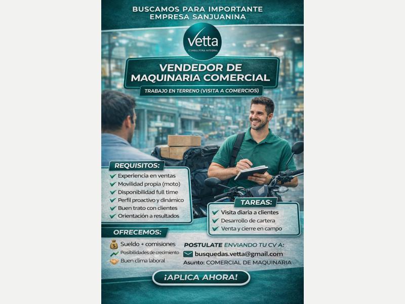 Buscamos Perfiles comerciales con disponibilidad full-time, con moto en condiciones, para trabajar en una empresa que vende maquinaria para comercios, zona capital. mandar cv a: [email protected] con el asunto: COMERCIAL DE MAQUINARIA- COMERCIAL