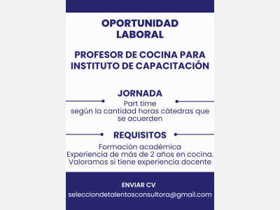 Estamos seleccionando PROFESOR DE COCINA para INSTITUTO DE GASTRONOMÍA PRIVADO. Solicitamos título habilitante y experiencia laboral comprobable. Se valorará experiencia docente. Se ofrecen 12 horas reloj (2 mañanas y 1 siesta). Buen ambiente laboral. Escribir al correo: [email protected]- EUDCACION
