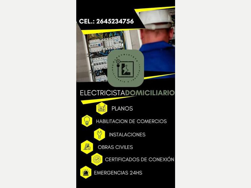 Electricista domiciliario ELECTRICISTA DOMICILIARIO Teléfono y Whatsapp 2645234756. Aprobación de planos, certificados eléctricos, habilitaciones comerciales etc...Instalo. Ventiladores de techo. Cambios de llaves, cables, enchufes, apliques, lámparas, etcEmergencias. Cableados en construcciones..Zonas:Rawson, Pocito,Medano, Chimbas, Rivadavia, Santa Lucía, Marquesado, Ciudad san Juan.Casas, Dptos, locales, fincas, negocios , oficinas, etc