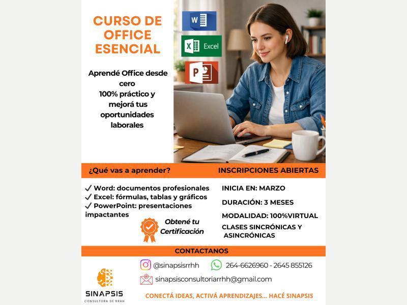 Curso de Office 100%Virtual Dominá Office y llevá tus habilidades al siguiente nivel! ¿Querés trabajar mejor, más rápido y con herramientas actuales? Este curso de Office Esencial es para vos? Inicio: 9 de marzo? Duración: 3 meses? Carga horaria: 4 hs semanales.